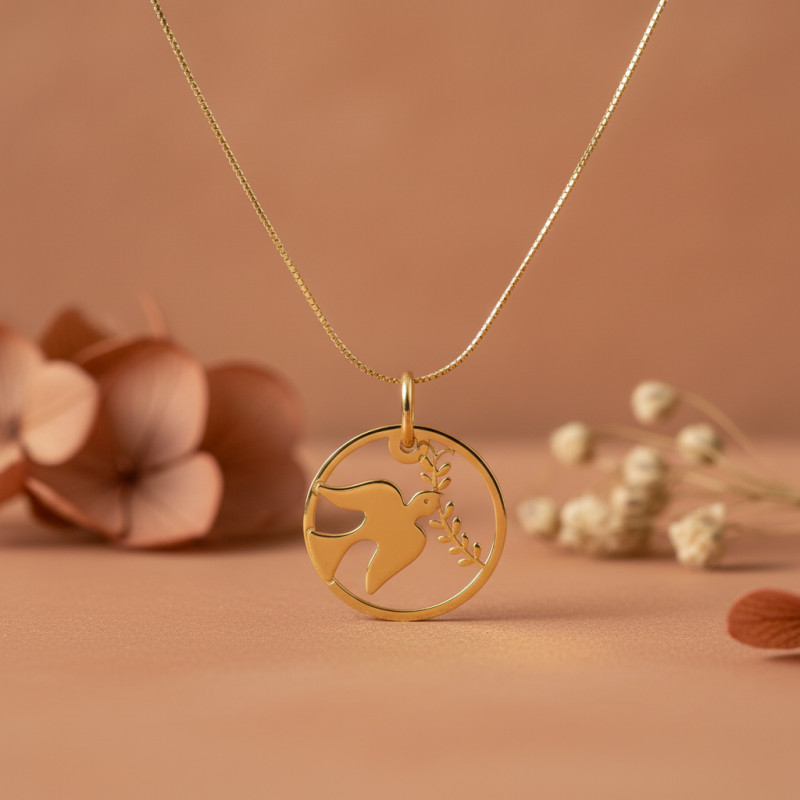 Elégante et contemporaine, découvrez cette médaille colombe ajourée composée d'or jaune 375/1000 (9K) ou 750/1000 (18K) où figure une colombe au rameau. Celle-ci symbolise la paix et la liberté. Dans la bible, la colombe est présente dans l'histoire de l'arche de Noé, où elle rapporta une feuille d'olivier pour prévenir que le déluge était passé et que l'eau avait baissé. La médaille de baptême mesure 15 mm de diamètre et comporte une bélière de forme ovale.