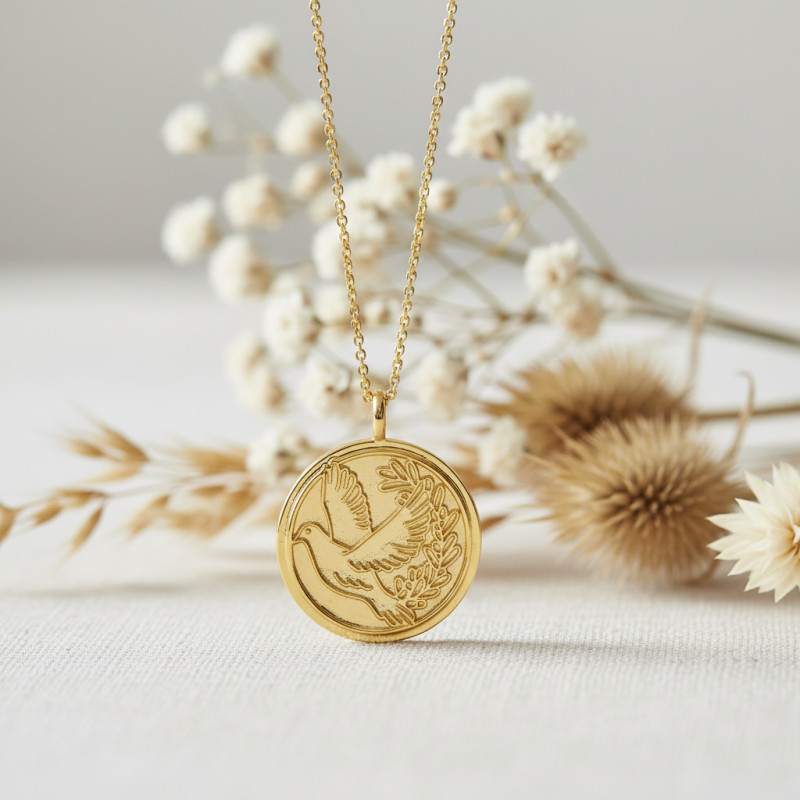 Tombez sous le charme de cette belle médaille colombe. Elle est conçue en laiton plaqué or jaune 750 (3 microns) et présente un fini poli/satiné qui lui confère du charme. Ce bijou vous fera briller en toute occasion et ajoutera une touche d'élégance et de raffinement à votre look. De forme ronde, il est décoré avec une illustration d'une colombe aux ailes déployées, prête à s'envoler. C'est un symbole riche de sens, évoquant la paix, l'espérance et l'amour.