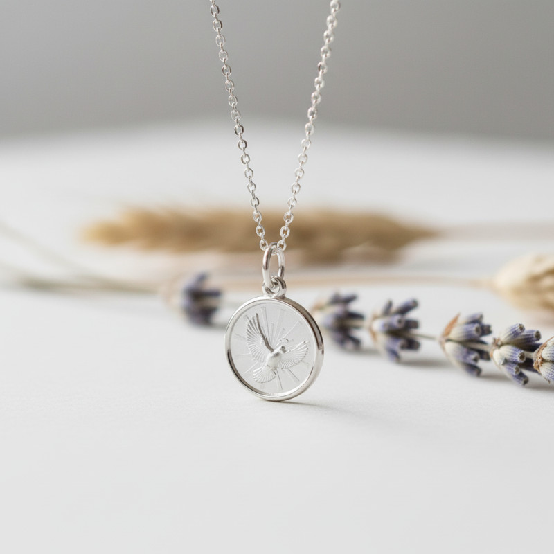 La colombe gravée au cœur du pendentif exprime une symbolique profonde. Dans de nombreuses cultures, elle incarne la paix, la liberté et le nouvel espoir. Sa position en plein vol, avec des ailes déployées, évoque le désir de s'affranchir des contraintes, d'explorer de nouveaux horizons.