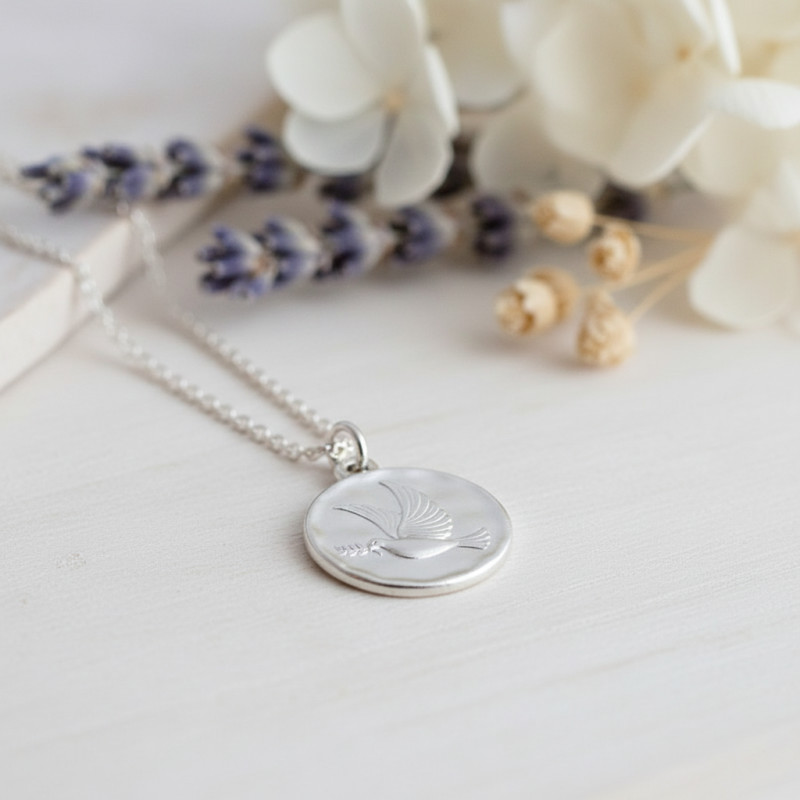 Dans un monde où chaque bijou raconte une histoire, cette médaille en argent massif se distingue par son charme singulier. Avec une silhouette ronde emblématique et une texture lisse, elle capte la lumière d'une manière unique, révélant la finesse de la colombe en plein vol gravée sur sa surface. La colombe, tenant un rameau d'olivier, transcende la simple esthétique pour devenir un symbole universel de paix et d'harmonie.