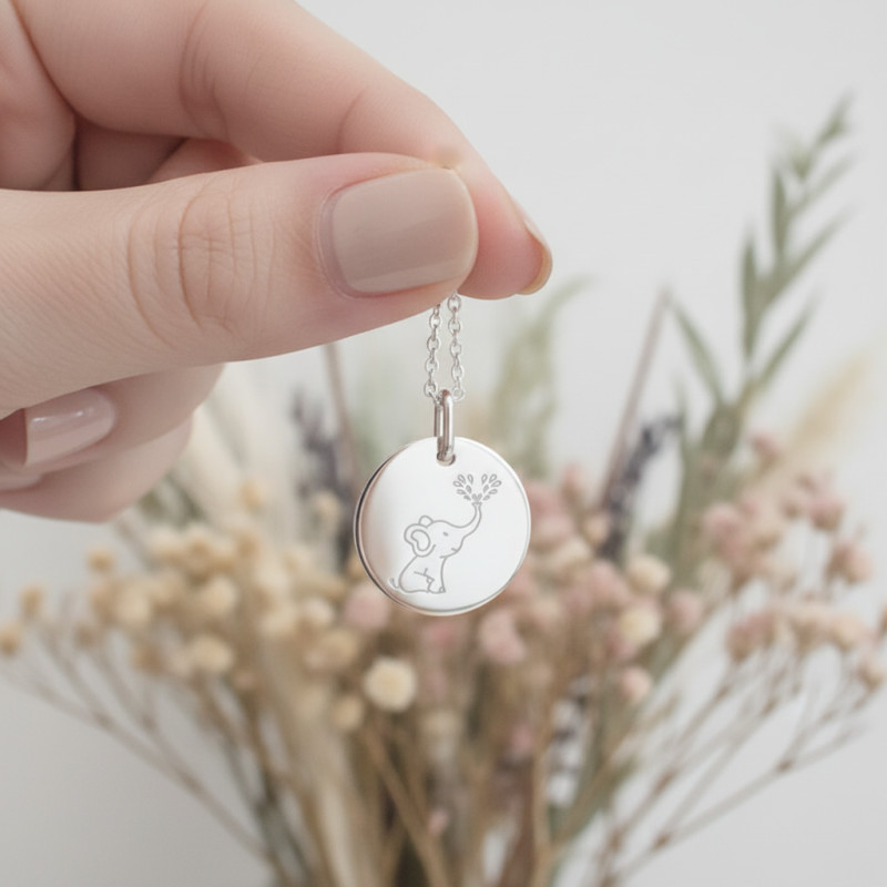 Aujourd'hui, nous avons choisi en collaboration avec la maison Lucas Lucor de vous présenter cette douce médaille pour enfant. Cette médaille de baptême est réalisée en or blanc 375/1000 (9K) et 750/1000 (18K) pour répondre à toutes les demandes. De forme ronde, elle vous est proposée dans un diamètre de 16 mm ce qui reste discrète. Sur son recto, vous aurez le plaisir de trouver une représentation d'un petit éléphant qui souffle de sa trompe des petits coeurs. Cet éléphant plaira aussi bien aux petites filles qu'aux petits garçons.