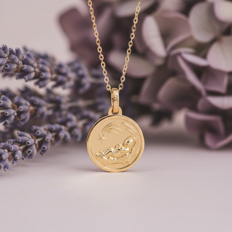 Cette charmante médaille enfant Jésus apportera à votre apparence une note plus apaisée. Faite en or jaune 750/1000 (18K), elle arbore une couleur dorée qui vous permettra de la marier avec un large choix de tenues. De forme ronde, elle présente une finition polie qui rehausse son éclat. Ce bijou mixte dévoile une magnifique représentation de l'enfant Jésus allongé dans un grand calme. Cette gravure fait de ce dernier un symbole d'espoir que vous pourrez offrir à un être cher.
