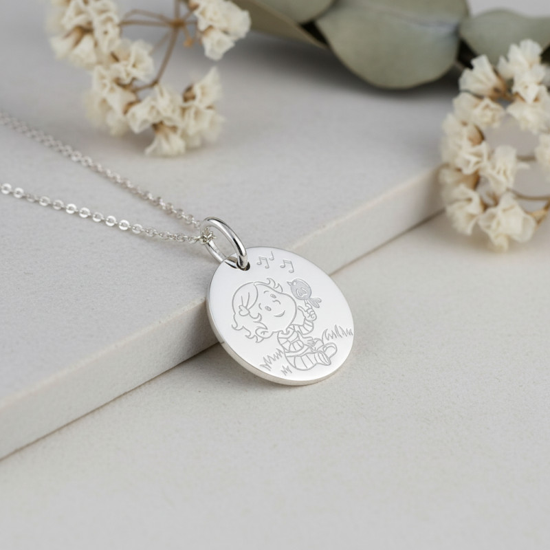 Nous vous conseillons d'opter pour cette charmante médaille fille et oiseau qui est dotée d'une couleur argentée. Elle est faite en or blanc 375/1000 (9K) ou en or blanc 750/1000 (18K), un métal noble lui confère une durabilité accrue sur de longues années. La beauté de ce bijou est accentuée par sa gravure qui est la représentation d'une petite fille assise et toute joyeuse ayant les yeux fixés sur un oiseau qui chante.