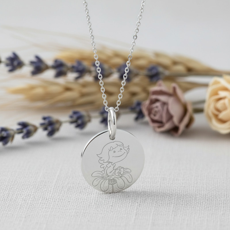 Craquez pour le charme de cette superbe médaille fille sur fleur arborant une couleur argentée. Elle est entièrement fabriquée en or blanc 375/1000 (9K) ou en or blanc 750/1000 (18K) pour une meilleure résistance à l'épreuve du temps. C'est un modèle parfait à porter au quotidien que vous pourrez assortir à n'importe quelle tenue de votre enfant. La beauté cette médaille se centre sur la gravure dont elle se pare : une petite fille souriante assise sur une fleur géante.