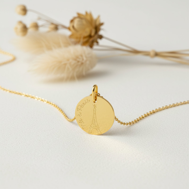 Le modèle présenté dévoile la gravure "Né à Paris" avec la tour Eiffel placée au centre. Veuillez noter qu'il est préférable de le porter sur une chaîne dont le poids est supérieur pour éviter la casse.