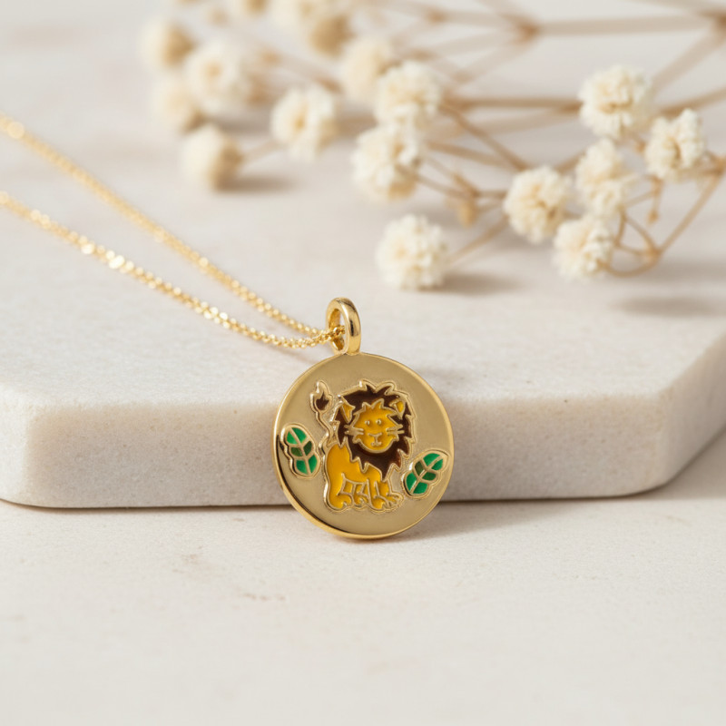 Nous vous suggérons cette superbe médaille Lion de couleur dorée. Elle est confectionnée en laiton et est plaquée en or jaune 3 microns avec une finition polie qui lui confère plus d'éclat. Ce bijou est mis en valeur avec un motif lion jaune et marron réalisé avec de la laque. Ce dernier est encadré par deux feuilles vertes et il est considéré comme un symbole de justice et de bravoure.