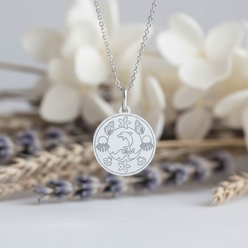 En collaboration avec la maison Lucas Lucor, nous avons choisi de vous proposer sa sélection de médaille de baptême. Comme cette médaille réalisée entièrement en or blanc, en 375/1000 (9K) et 750/1000 (18K). Ce bijou vous est proposé dans une forme ronde et dans un diamètre de 16 mm qui ira aussi bien à un enfant qu'à un adulte. En son centre, vous trouverez une charmante représentation d'un monde marin avec un petit dauphin entouré par des coquillages et des méduses. Cette médaille laïque pourra être offerte lors d'une naissance, un baptême ou encore un anniversaire.