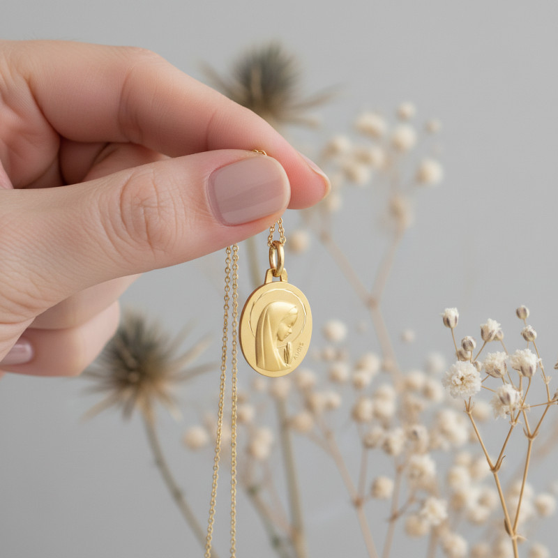 Vous succomberez à coup sur au charme de ce sublime modèle, au style sobre et traditionnel, réalisé entièrement en or jaune 750/1000. Cette médaille, de forme ovale et à la finition satinée, vous révèle donc une représentation de la Sainte Vierge en prière, coiffée d'un élégant voile, avec une auréole biseautée. Il s'agit d'un bijou fin et délicat, à la symbolique douce, que vous pourrez donc offrir à un enfant à l'occasion de son baptême par exemple. En ce qui concerne les dimensions de cette médaille, elle dispose d'une hauteur de 16 mm, sur une largeur de 13 mm et pour un poids d'or moyen de 1,50 gramme.