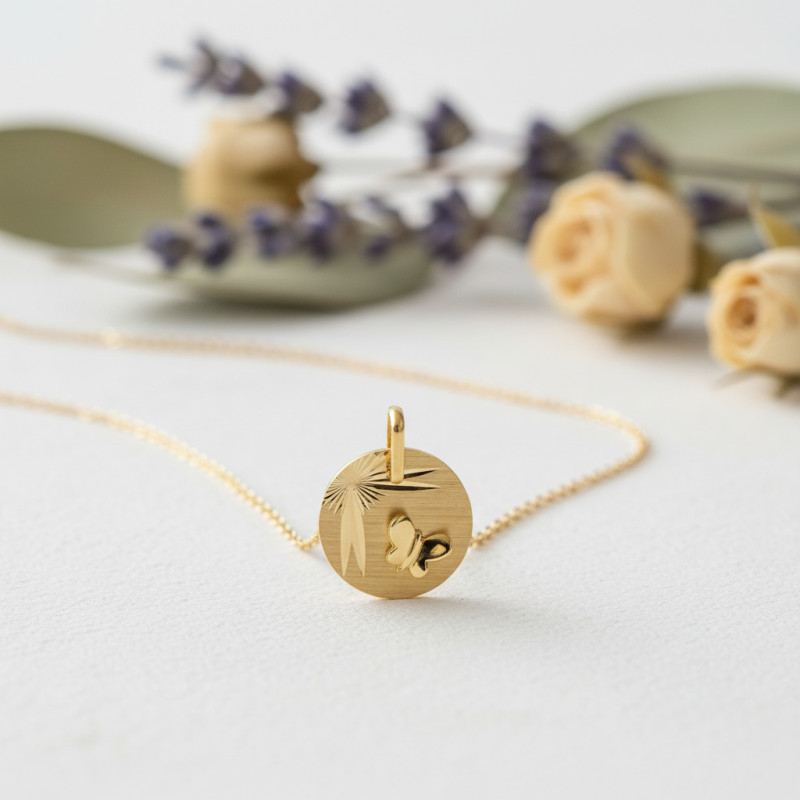 Craquez alors pour cette superbe médaille conçue en or jaune 750/1000. Raffiné et finement réalisé, ce bijou de 14 mm de diamètre vous dévoile un somptueux papillon aux ailes déployées et un singulier motif aux allures de fleur, directement gravé dans la matière. Accompagné d'une chaîne, il apportera une touche d'élégance à toutes vos tenues. N'hésitez pas également à lui ajouter la gravure de votre choix au verso, comme un prénom, une date ou tout autre message.