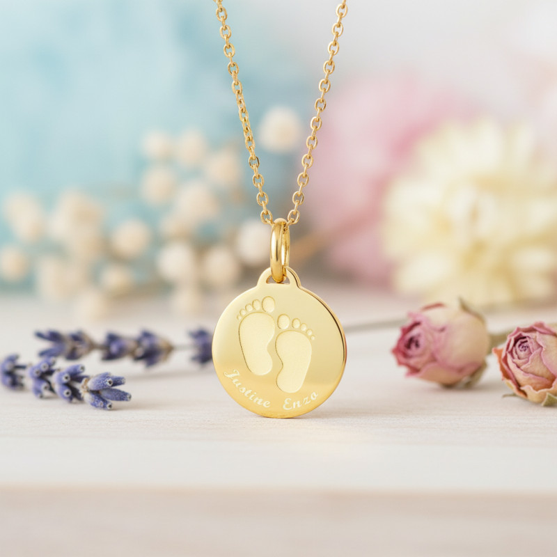 La maison vous propose de succomber pour cette merveilleuse médaille qui va vous plaire à coup sûr ! Cette médaille est réalisée en or jaune 375/1000 (9K) ou 750/1000 (18K) et nous dévoile un doux motif sur sa face. En effet, vous trouverez deux petits pieds d'enfants ou vous pouvez faire graver en-dessous deux prénoms. Sachez que cette médaille a un diamètre de 22 mm. Enfin, comptez un pois d'or moyen de 1,50 gramme en or 375/1000 (9K) et de 2 grammes en or 750/1000 (18K).