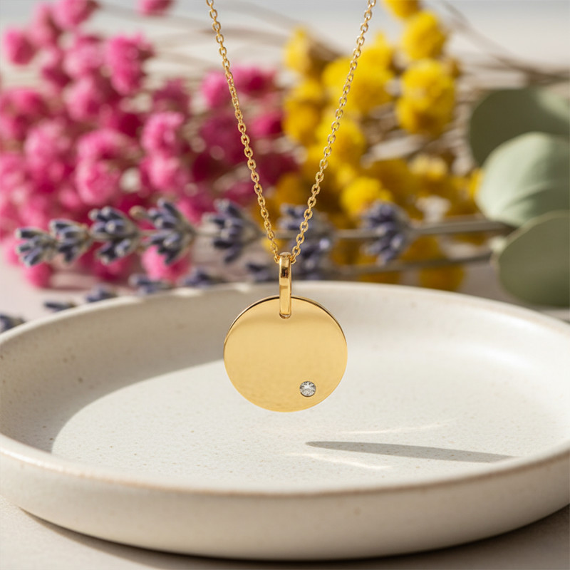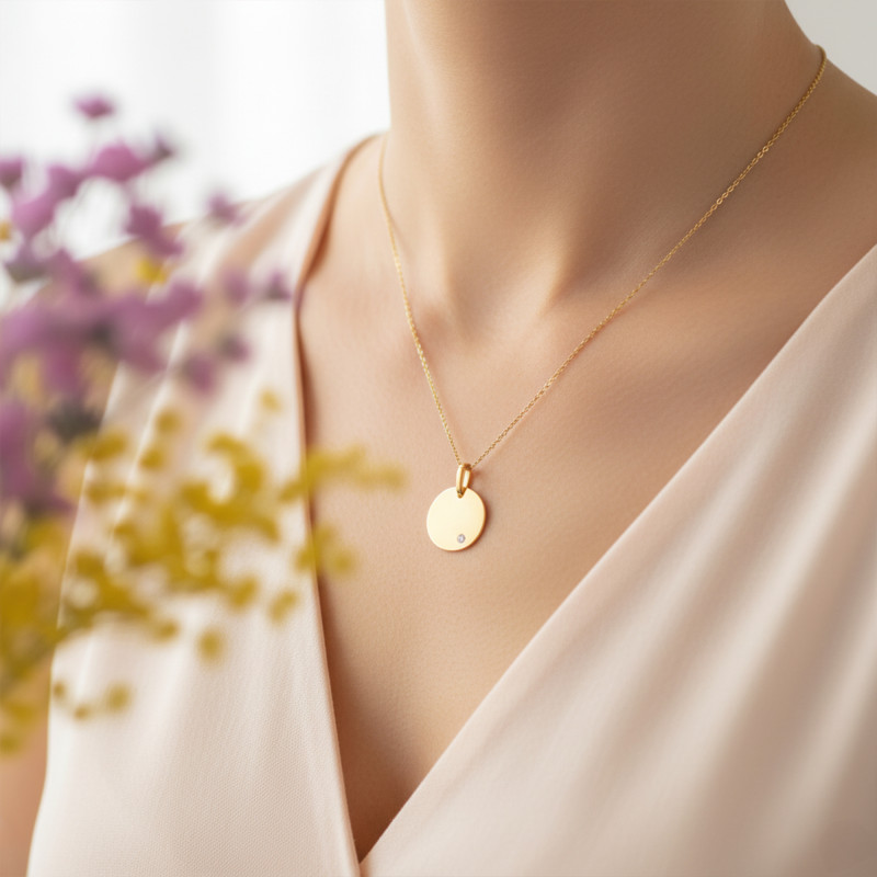 Sur la médaille ronde en or jaune 375/1000 (9K) un zyrcon accompagnera le recto tandis que sur la médaille en or 750/1000 (18K) il s'agira d'un diamant de 0,01 carat.