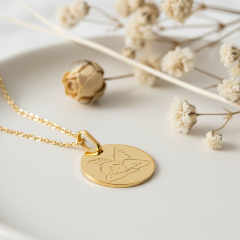 Optez pour cette belle médaille ange ronde qui sublimera les enfants. Elle est fabriquée en or jaune avec 15 mm de diamètre et s'accordera parfaitement à toutes les tenues. Sa surface affiche la représentation d'un petit ange assoupi, un motif à caractère religieux faisant de ce bijou un cadeau idéal lors d'un événement sacré. Elle est dotée d'une couleur dorée qui est éclatante grâce à la finition polie appliquée, ce qui lui confère un bel aspect.
