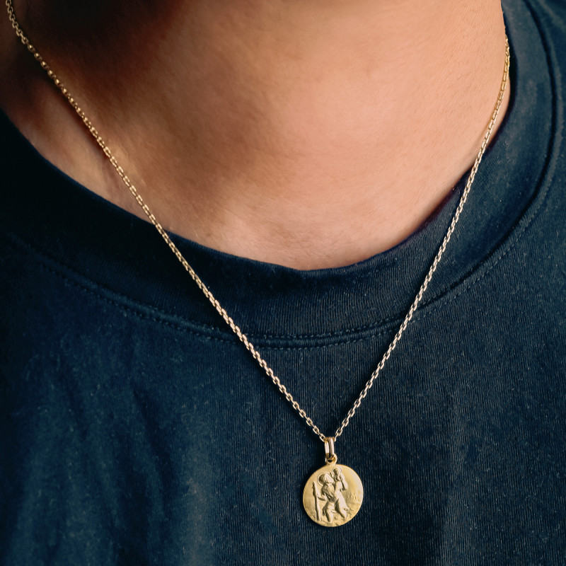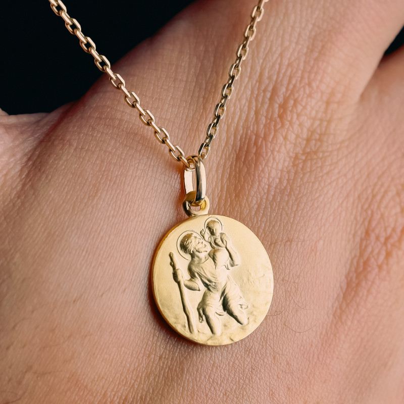 Captivant, cette médaille de baptême délicatement façonnée épousera magnifiquement votre cou. Elle accueille sur sa surface une belle représentation du Saint-Christophe portant sur son épaule l'enfant Jésus. Connu comme étant le patron des voyageurs, ce dernier vous accompagnera pendant votre voyage sur la terre. Brillante et élégante, cette médaille pesant seulement 3,45 grammes garantit un port confortable.