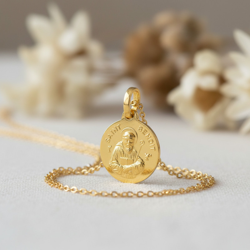 Nous sommes heureux de vous présenter cette jolie médaille Saint Benoît de couleur grise. Elle est réalisée en or jaune 750/1000 (18K) avec une surface polie qui lui donne plus d'éclat. Saint Benoît représente ici le maître spirituel, comme père des moines d'Occident et comme Patron de l'Europe. Notez que le poids d'or moyen de ce bijou est de 1,85 gramme, ce qui traduit sa légèreté.