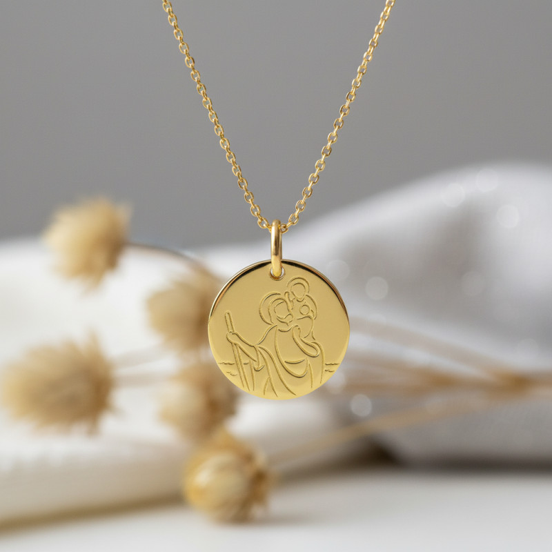 Faites le choix de cette ravissante médaille à l'effigie du Saint Christophe pour marquer une occasion religieuse comme un baptême ou une communion. Ce modèle rond de 16 mm de diamètre fascine par sa gravure travaillée au laser qui lui accorde un charme intemporel. Il s'agit d'une délicate illustration du Sain Christophe, le patron des voyageurs, portant l'enfant Jésus sur ses épaules et traversant une rivière. Les deux saints symbolisent la protection, la guidance et la bienveillance.