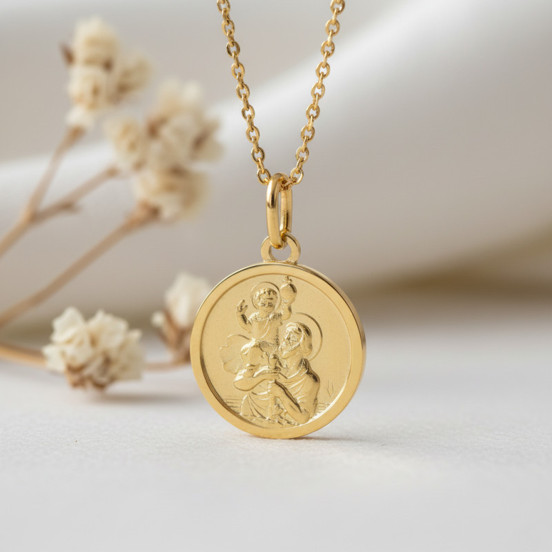Laissez-vous charmer par cette superbe médaille ronde en or jaune 750/1000 (18K) représentant Saint Christophe tenant l'Enfant Jésus sur son épaule. D'un diamètre de 22 mm, cette médaille a un poids d'or de 7,50 grammes. Le bord de cette médaille est poli et le centre est satiné, pour mettre en valeur le motif central.