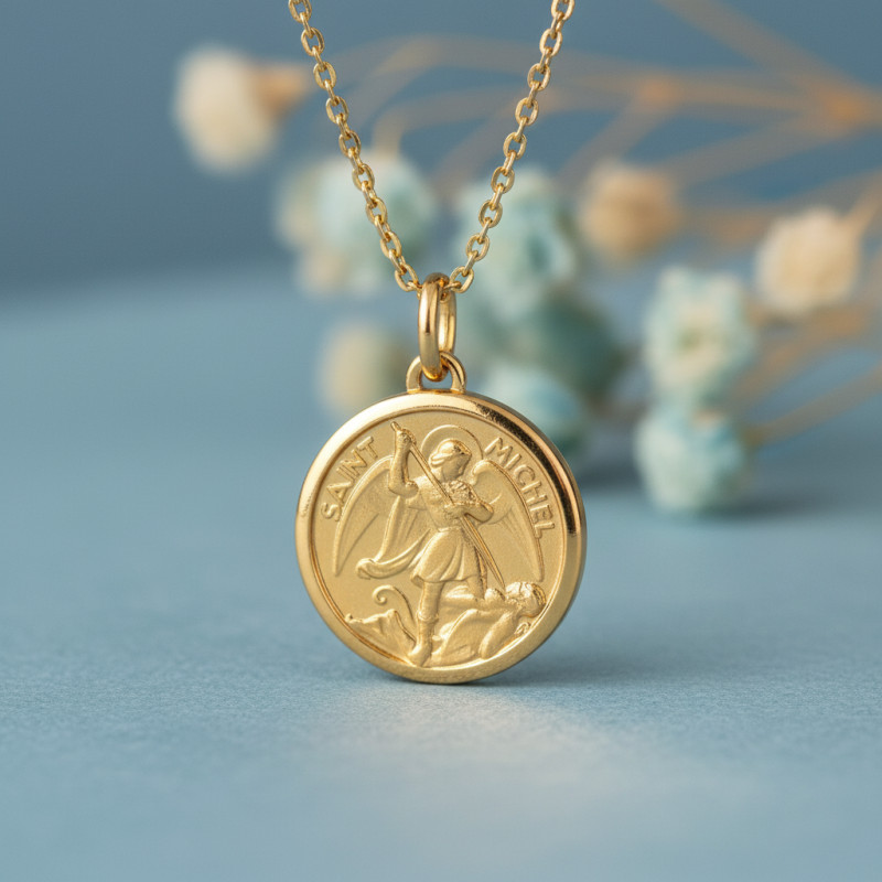 Lucas Lucor vous dévoile sa très jolie médaille de Saint Michel en or jaune. Cet archange est connu pour être le protecteur de la France. Comme souvent il est représenté un bâton à la main, maitrisant le démon. Cette médaille vous est proposée avec un diamètre de 18 mm, ce qui correspond approximativement à une pièce de 2 centimes d'euro.