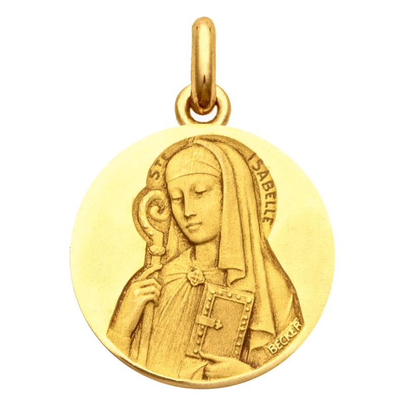Becker, spécialiste des médailles religieuses propose ce modèle représentant Sainte Isabelle sur un pendentif en or jaune de qualité 750. Le fond de la médaille possède une finition polie tandis que le corps de Sainte Isabelle est sablé afin d'apporter un contraste avec le mat et le brillant.