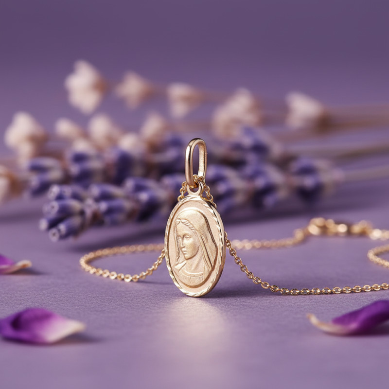 Aujourd'hui, nous avons choisi cette ravissante médaille Sainte Marie pour vous. Dorée, elle est façonnée en or jaune 375/1000 (9K) et saura perdurer dans le temps sans perdre son éclat du premier jour. De forme ovale, elle affiche 25 mm de hauteur pour une largeur de 10,50 mm. Sur sa face avant, vous remarquerez la présence d'une jolie gravure de la vierge Marie, voile sur la tête et le regard vers le bas. Pour un aspect encore plus soigné, cette médaille dispose d'une bordure texturée.
