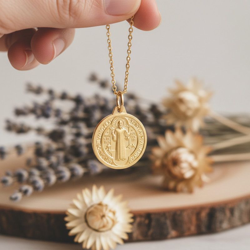 Parmi ses magnifiques créations, nous avons choisi pour vous cette ravissante médaille de baptême d'une symbolique riche, dont la beauté et l'esthétisme se refléteront sur votre look. Elle est conçue en or jaune 750/1000 (18K) et arbore une finition sablée qui lui donne une allure classique. De forme ronde, elle présente une bordure facettée et un centre illustrant Saint Benoît représenté avec une canne dans sa main droite et un livre dans sa main gauche ainsi qu'une grande auréole rayée. Il est entouré par l'inscription "Eius in obitu nostro praesentia muniamur" (À l'heure de notre mort, soyons protégés par sa présence). Au verso du bijou, apparaît la croix avec les lettres C S P B (Crux Sancti Patris Benedicti, La Croix du saint Père Benoît), C S S M L (Crux Sacra Sit Mihi Lux, Que la sainte Croix soit ma lumière) et N D S M D (Non Draco Sit Mihi Dux, Que le dragon ne soit pas mon guide).