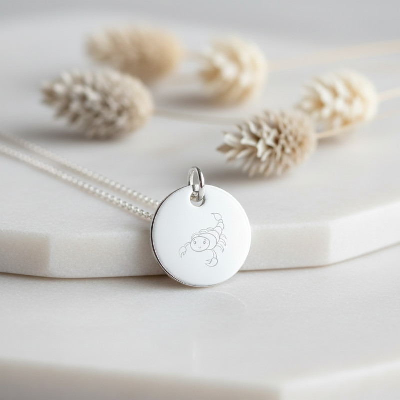 Cette médaille signe astrologique est réalisée tout en argent massif 925 pour perdurer dans le temps. Elle dispose d'un diamètre intime de 15 mm, et est une ode au signe astrologique du Scorpion. Sa surface polie et brillante reflète une lumière douce, tandis que le dessin délicat et enfantin du scorpion s'étire gracieusement sur sa surface grise et élégante. Pesant 1,46 gramme, cette pièce est à la fois légère et empreinte d'un symbolisme profond que vous pourrez accorder à l'une de nos chaines en argent.