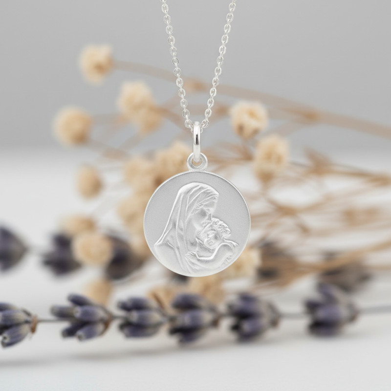 Emparez-vous de cette ravissante médaille de baptême ronde. Elle est fabriquée en argent 925 ce qui lui confère ce ton gris à l'allure captivante. Elle est circulaire, soigneusement polie et affiche 17 mm de diamètre avec une finition satinée donnant cet effet grainé. En surface, elle arbore une représentation de la Vierge Marie, portant un voile sur sa tête et tenant son enfant Jésus dans les bras. Imposant et symbolique, ce motif apporte un caractère religieux à ce bijou.