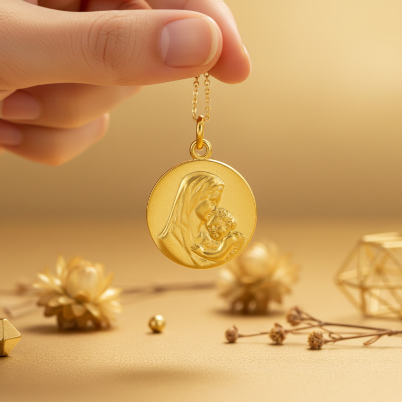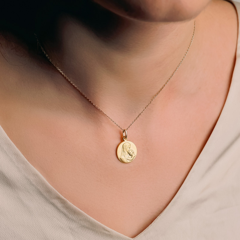 Comme cette médaille de baptême réalisée en or jaune 750/1000 (18K) (750/1000) que nous vous dévoilons qui est une représentation très traditionnelle de la Vierge à l'enfant. Une ravissante médaille sur laquelle la Vierge Marie, coiffée d'un voile, tient l'enfant Jésus tendrement contre elle. Beaucoup de douceur se dégage de cette création de la marque française Emanessence.