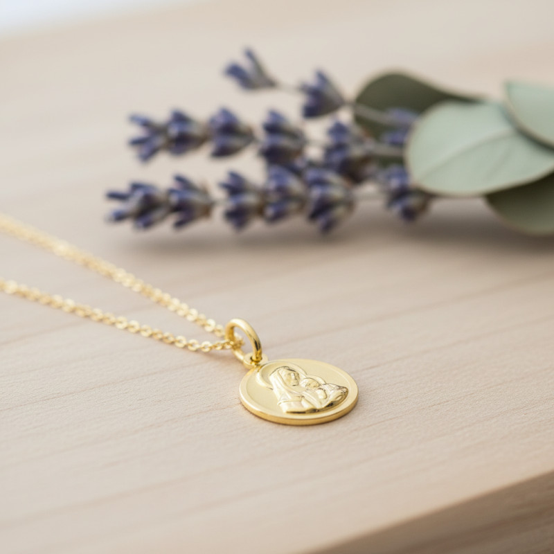 Cette fabuleuse médaille Vierge à l'enfant vous ira à merveille. Elle est façonnée en or jaune 375/1000 (9K) avec une finition polie donnant cette allure brillante. Elle est également satinée et prend une taille ronde affichant 12 mm de diamètre avec une couleur dorée qui se mariera avec tous vos accessoires. Elle est légèrement démarquée et présente à la surface un joli motif à caractère religieux. Il s'agit d'une belle représentation en relief de la Vierge Marie avec son enfant Jésus dans les bras et des auréoles au-dessus de leur tête.
