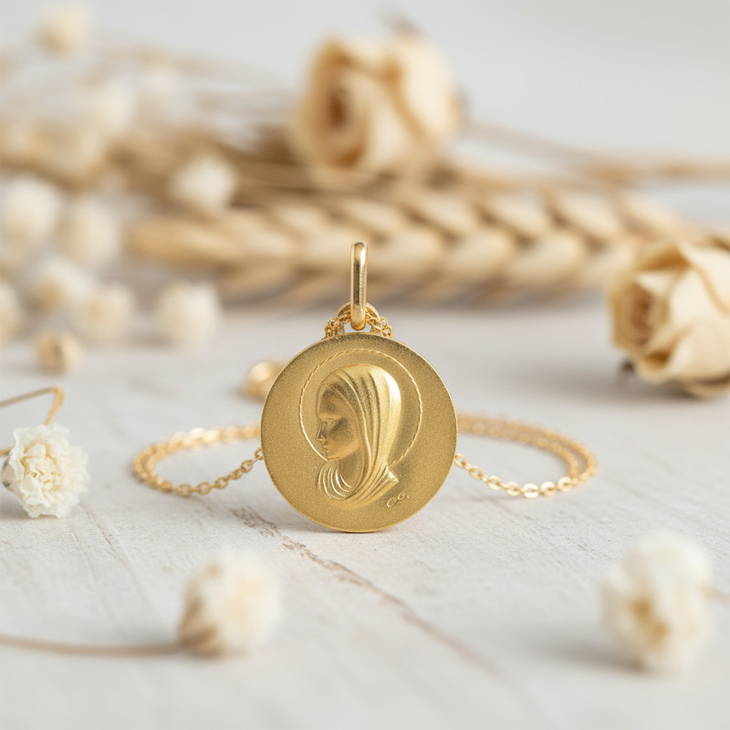 Laissez-vous séduire par cette médaille Vierge Marie ronde à l'allure soignée. Elle est fabriquée en or jaune 750/1000 (18K) et affiche 15 mm de diamètre. Elle prend une forme circulaire et est à la fois sablée et polie, ce qui lui apporte une touche captivante. À la surface, elle est sublimée par une illustration en relief de la vierge Marie portant un voile avec une auréole au-dessus de la tête. Ce motif en mère de Jésus, apporte un style religieux à ce bijou et rehaussera votre look en toute occasion.