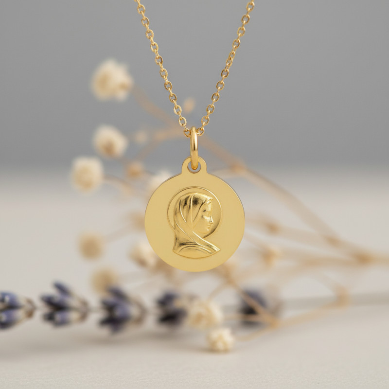 Optez pour cette belle médaille vierge bienveillante pour fêter une naissance ou pour commémorer un baptême, une communion ou tout autre événement spécial. Réalisée en or jaune 375/1000 (9K) ou 750/1000 (18K), elle a une forme ronde de 16 mm de diamètre et est sublimée par une finition sablée. Son centre met à l'honneur la Vierge Marie, symbole de bonté, beauté et douceur. Rehaussée d'une auréole, la sainte est présentée de profil avec un voile qui entoure son délicat visage.