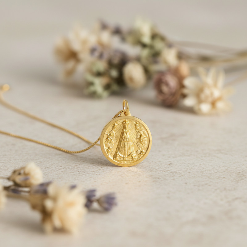 Nous sommes ravis de vous présenter cette charmante médaille de baptême ronde, réalisée en or jaune 750/1000 (18K). Elle dévoile en son centre le Vierge de Begoña, couronnée, vêtue de son long manteau et entourée de plusieurs petits anges. Elle est la sainte patronne de Biscaye et chaque 11 octobre, la ville célèbre une romeria en son honneur avec un pèlerinage menant jusqu'à la basilique portant son nom. Ce modèle possède un diamètre de 18 mm et un poids d'or moyen de 2,60 grammes.