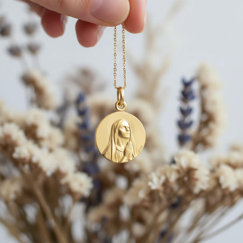 Afin de vous sublimer en toute occasion, nous avons choisi cette magnifique médaille Vierge en contemplation pour vous. Façonnée en or jaune 750/1000 (18K), elle arbore une jolie teinte dorée qui ne passera pas inaperçu. Avec ses 16 mm de diamètre, ce pendentif illustre la Vierge Marie en pleine prière avec son auréole au-dessus de sa tête. Cette représentation fait partie des nombreuses vertus de la Sainte telles que sa prière mentale constante, sa foi vive ou encore sa sagesse divine.