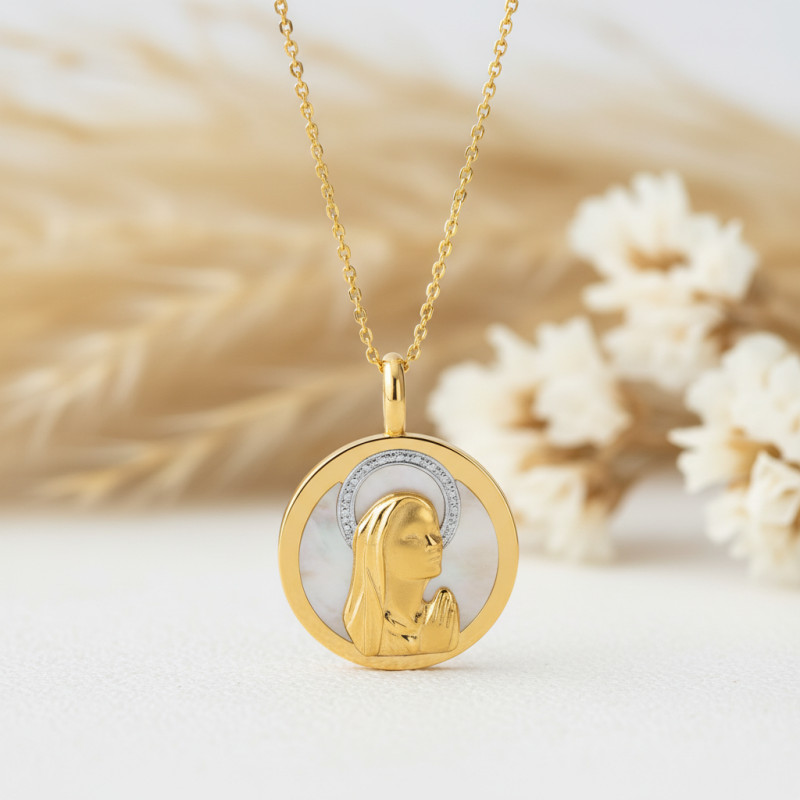 Cette très belle médaille ronde représente une vierge en prière. La vierge est en or jaune tandis que son auréole est en or blanc 375 avec une finition diamantée. Le fond de la médaille est en nacre ce qui apporte son unicité à chaque médaillon. Elle est fabriquée par notre partenaire Vandona, spécialiste des bijoux en or en Espagne.