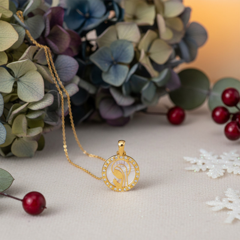 Cette élégante médaille de baptême est signée par la maison Vandona. Elle a été réalisé entièrement en or jaune 375/1000 (9K) pour garder sa belle couleur jaune durant des années. Elle dispose d'une forme ronde et nous dévoile en son centre une représentation de la Vierge Marie. Elle est en train de prier et est représentée sur un motif en nacre blanche contrastant élégamment.