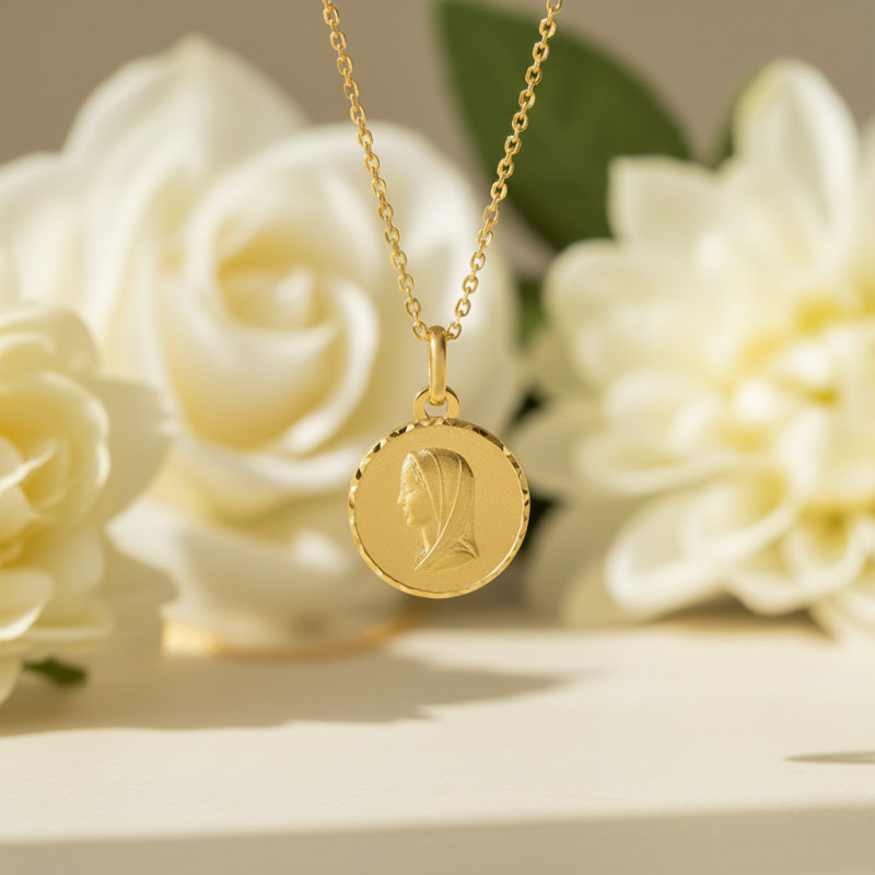 Au centre de ce bijou, on retrouve la Vierge Marie se tenant de profil, le regard droit et les cheveux recouverts d'un voile. Une médaille qui vous permettra d'être sous la protection de la Sainte Vierge.
