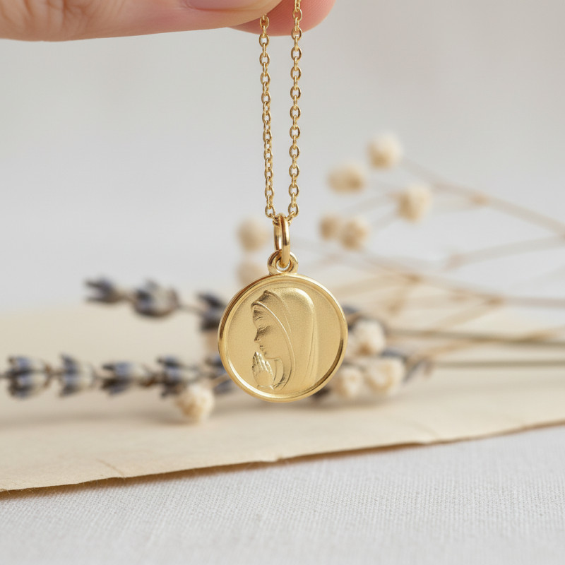 Spécialisé dans la fabrication de bijoux en or et notamment dans les médailles de baptême, notre partenaire Argyor vous dévoile cette très belle médaille de baptême de la Sainte Vierge Marie. Elle est représentée de profil, les mains jointes, en position de prière. Une représentation classique de la Vierge Marie, très appréciée pour célébrer un évènement religieux comme un baptême ou une communion.