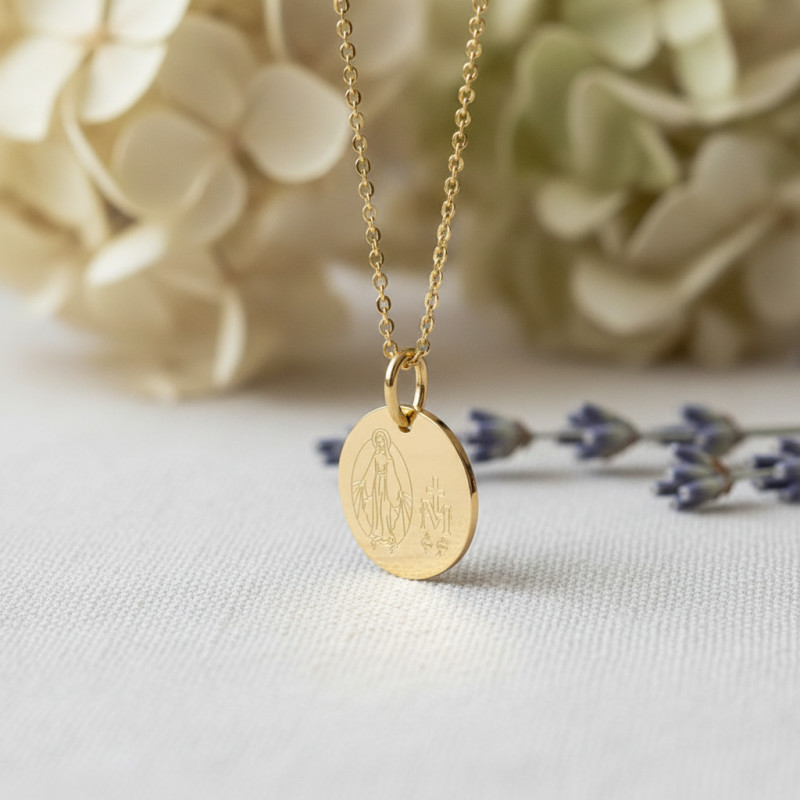 Cette médaille vierge miraculeuse vous ornera avec splendeur. Réalisée en or jaune, elle se pare d'une forme ronde avec une surface polie qui lui confère une allure brillante. Avec ses 16 mm de diamètre, elle envoie un message fort et significatif qui apporte de l'espoir aux fervents croyants. Sa face avant dévoile une représentation de la vierge miraculeuse se tenant debout avec des motifs illustrant la lettre M accrochée sur une croix avec deux cœurs vers le bas. Au verso, elle affiche une citation qui accompagne la personne qui la portera vers le salut “O Marie, conçue sans péché, priez pour nous qui avons recours à vous”. Entourés d'étoiles, ces mots apporteront du réconfort au quotidien.