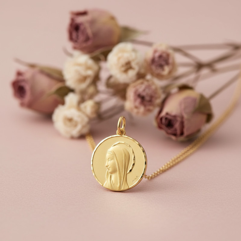 Marie de Nazareth, mère de Jésus, est un personnage essentiel dans la religion chrétienne et présente dans de nombreuses œuvres religieuses (peintures, sculptures, accessoires, etc.). Le bord et l'auréole qui entoure la tête de la Vierge sont facettés, ce qui donne beaucoup d'élégance à la médaille.