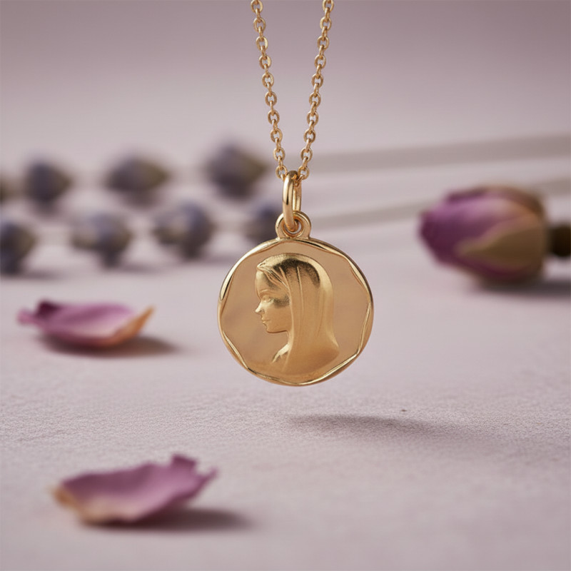 Nous vous proposons cette élégante médaille de baptême qui va vous plaire à coup sûr par sa haute qualité ! Elle vous est proposée avec une douce finition mate et satinée par la maison espagnole Argyor. Conçue en or jaune 375/1000 (9K), celle-ci représente la Vierge Marie. Accompagnée de sa bélière ovale, cette médaille affiche un diamètre de 16 millimètres pour un poids d'or moyen utilisé dans sa conception de 1,45 gramme.