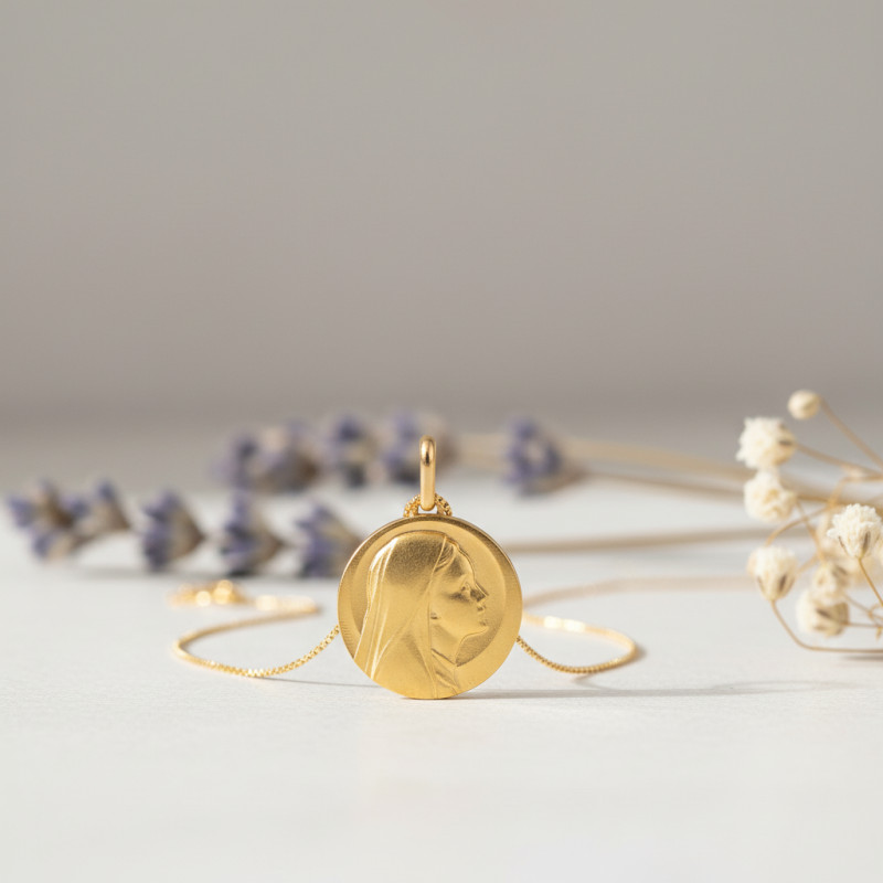 La superbe médaille Vierge de profil droit qui est présentée se pare d'une couleur dorée. Elle peut se marier avec tous les styles tout en apportant à votre look une note spirituelle. Le bijou a un diamètre commençant à 12 mm et un poids moyen d'or qui est de 1,50 gramme. Ce dernier est fabriqué en or jaune 750/1000 (18K) pour une meilleure durabilité sur le long terme.