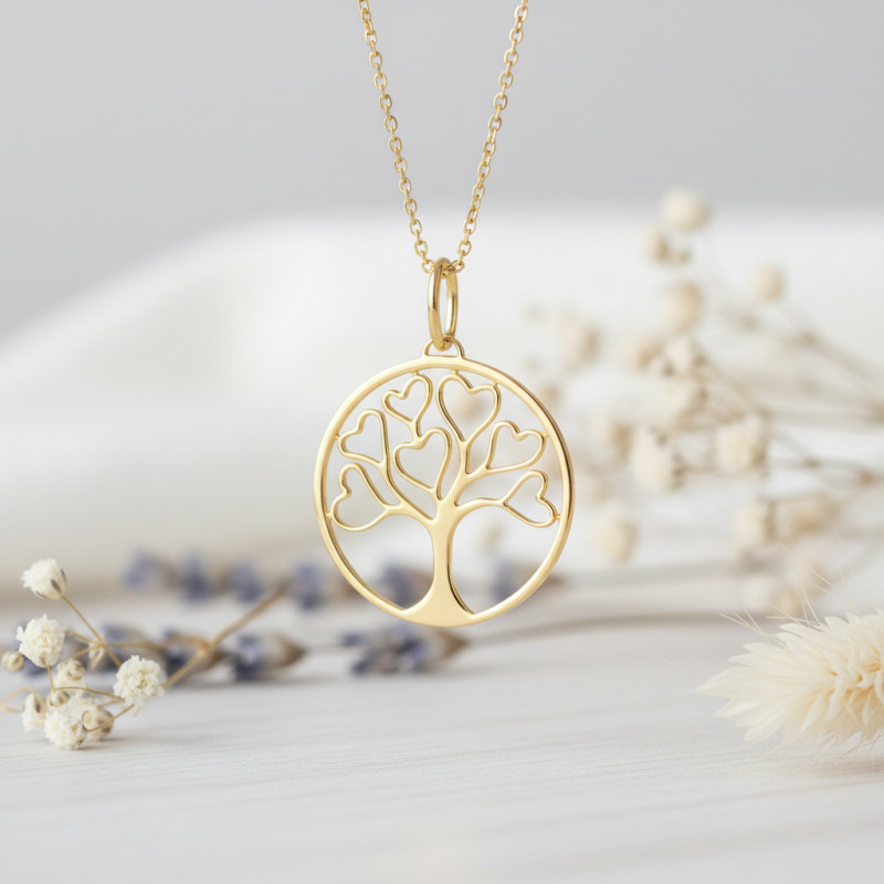 Pour parer votre cou avec distinction et charme, nous vous proposons de découvrir ce beau pendentif arbre de vie de couleur dorée. Entièrement réalisé en plaqué or jaune, il se pare d'une finition polie et apportera de la lumière à vos tenues. Ce modèle une forme ronde mise en valeur au centre par un motif ajouré. Il s'agit d'un arbre de vie ayant des coeurs en guise de feuille. Il apportera une touche élégante et romantique à votre allure.