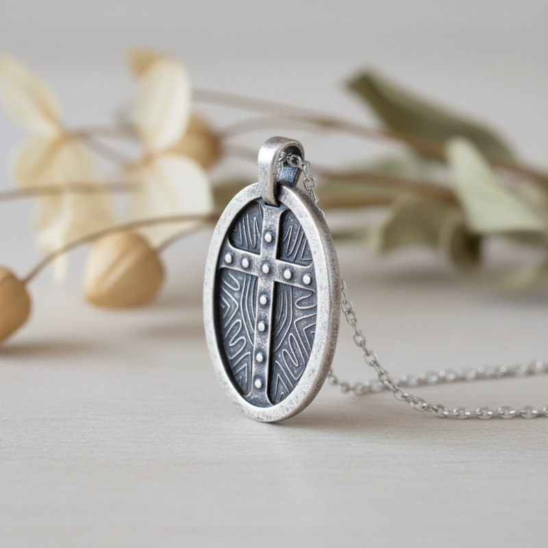 Comme ce pendentif très audacieux qui a été réalisé tout en argent 925/1000. Ce pendentif homme est de forme ovale et arbore une finition de type vieillie. Ce bijou vous est proposé avec les dimensions suivantes : 2 mm d'épaisseur, 20 mm de largeur et 28 mm de hauteur. Il prend la forme d'un bouclier et nous dévoile en son centre une croix.