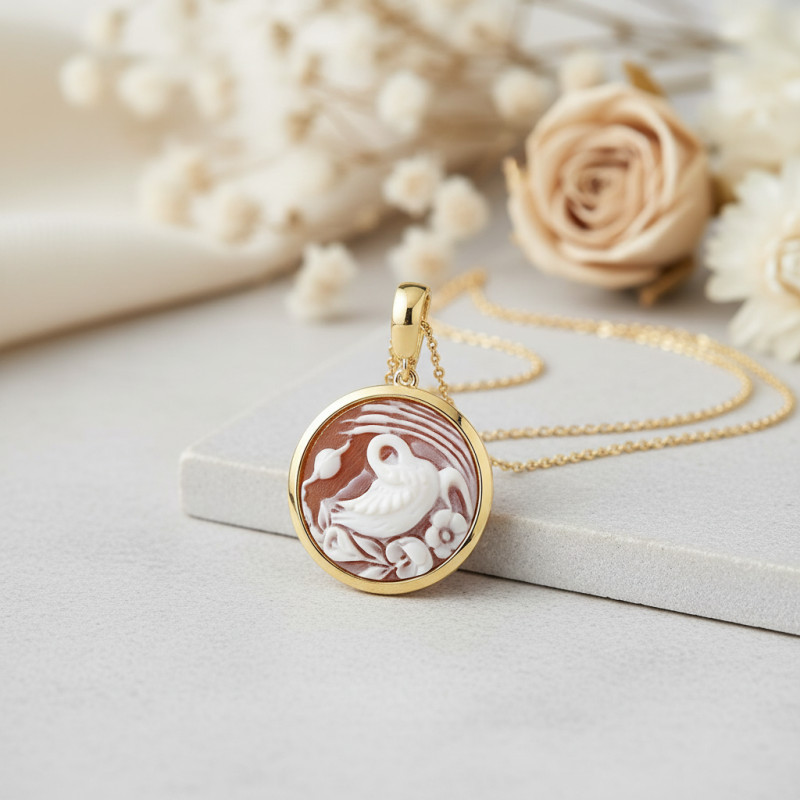 Nous avons opté pour vous proposer ce charmant pendentif camée. Façonné en argent 925, il dévoile une finition dorée. Il prend une forme ronde et se pare d'un fond travaillé en coquillage de couleur marron. Celui-ci est orné d'un camée arborant des fleurs à l'allure ravissante et un majestueux cygne flottant d'une beauté exceptionnelle. De couleur blanche, ce motif gravé à la main, offre une note resplendissante à ce bijou. Vous pourrez aussi l'offrir à une personne chère à vos yeux en signe d'affection.