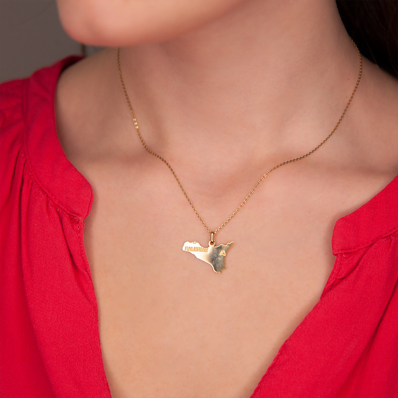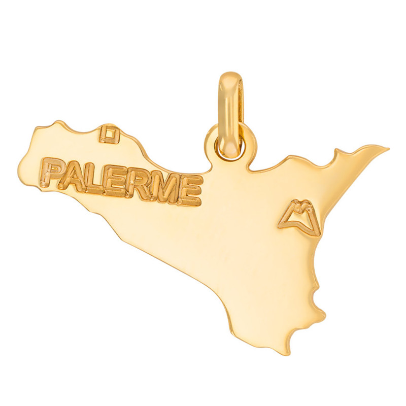 Vous craquerez alors surement pour cette pièce exclusive au design épuré et délicat. Nous vous proposons ce ravissant pendentif en or jaune représentant la carte de la Sicile. Il s'agit de la plus grande île méditerranéenne mais également l'une des vingt régions d'Italie. Ce pendentif révèle deux gravures, dont celle de Palerme, qui est la capitale de la Sicile, située au Nord Ouest de l'Ile, ainsi que le volcan de l'Etna, situé à l'Est près de la ville de Catane. C'est un magnifique pendentif qui ravira toutes les personnes originaires de cette ile, ainsi que les amoureux de cette région. En ce qui concerne les dimensions du pendentif, la carte mesure 15,5 mm de hauteur sur 25 mm de largeur.