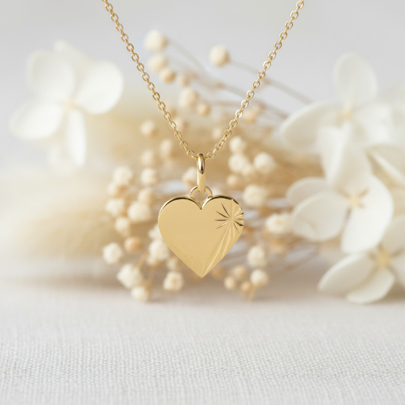 Ce charmant pendentif est réalisé entièrement en or jaune. Il est en forme de coeur pour symboliser l'amour qui vous uni. Elle représente un cœur avec un délicat motif ensoleillé qui vous permet de faire graver une inscription avec un message personnel.
