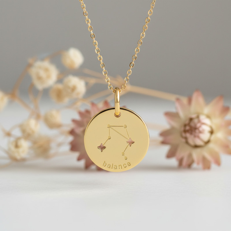 Comme cet élégant bijou qui a été réalisé entièrement en or jaune 750/1000 (18K) pour garder sa couleur pendant des années. C'est un pendentif de forme ronde qui vous propose un diamètre de 14 mm. En son recto une charmante représentation de la constellation du signe de la Balance. Les étoiles de cette constellation sont ajourées ce qui fait toute la différence. Cette constellation est située entre celle de la Vierge et du Scorpion et est reconnaissable grâce à son étoile Zuben el-Schamali. Ce signe est lié aux personnes nées entre le 22-23 septembre et le 22-23 octobre.