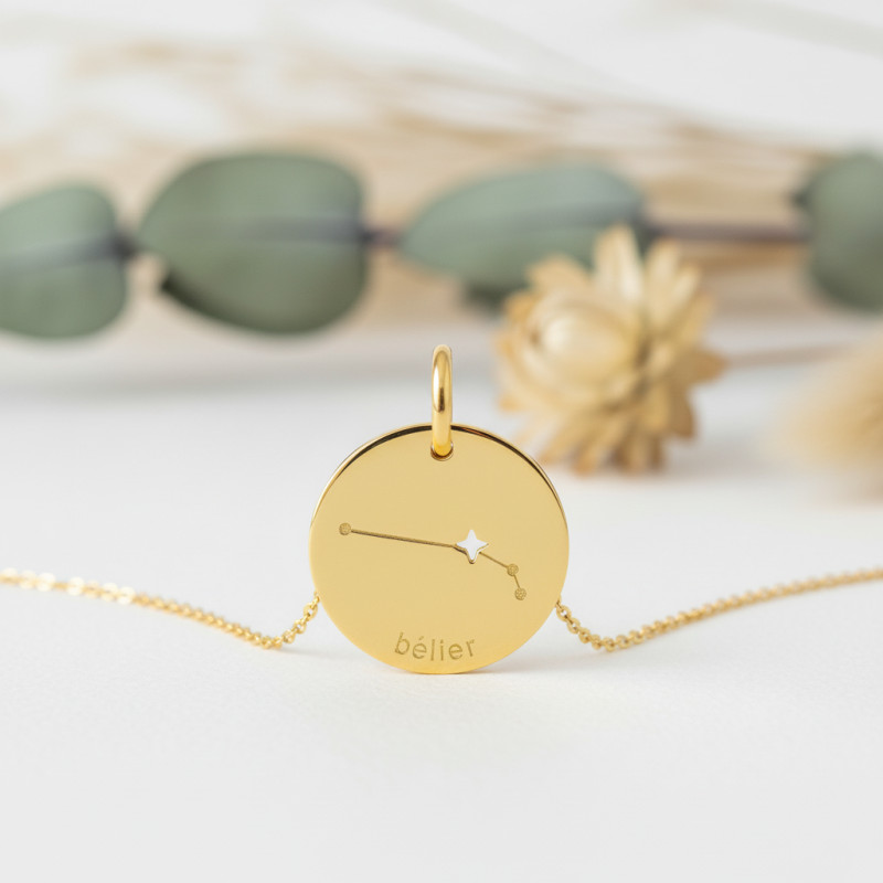 Comme cet élégant pendentif qui a été réalisé tout en or jaune 750/1000 (18K) pour perdurer dans le temps. Ce pendentif de forme ronde vous propose un diamètre de 14 mm parfait pour convenir aux enfants et aux adultes. Ce bijou vous propose en son centre la constellation du signe du Bélier. Ce signe est lié aux personnes nées entre le 21 mars et le 20 avril. La constellation du bélier se compose des trois étoiles Alpha, Bêta et Gamma et se continue par quelques petites étoiles qui la complètent sur Epsilon, Delta et Dzêta.