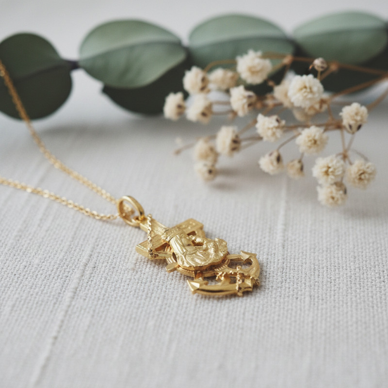 Quoi de mieux que ce merveilleux pendentif croix marine pour mêler spiritualité et élégance. Aussi original que moderne, ce dernier se fera une place sur votre cou au quotidien. Il est réalisé en or jaune 375/1000 (9K) et reflète un doux éclat grâce à son polissage. Ce pendentif religieux se compose d'une croix texturée qui se termine par une ancre marine, représentant l'espérance et la foi. Au centre, on trouve un gouvernail affichant une figure en relief de Notre-Dame du Carmel, apportant à l'ensemble une profondeur symbolique.