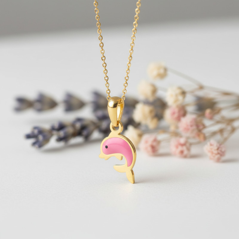 Ravissant pendentif enfant conçu à partir d'or jaune et représentant un dauphin. Ce petit animal très appréciée par les plus petits est recouvert d'émail de couleur rose, lui apportant beaucoup de charme et d'originalité.