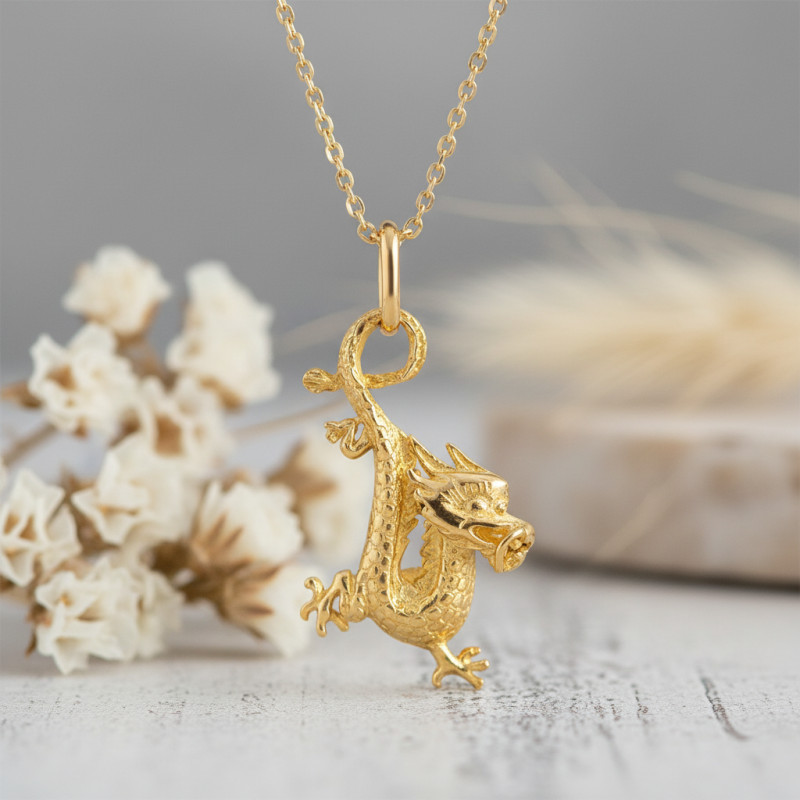 Médaille Précieuse vous propose ce pendentif en forme de dragon. Il est proposé en or jaune 9 ou 18 K.
